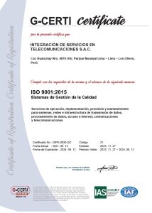 En ISETEL PERÚ, nos guiamos por un enfoque basado en procesos, mejora continua y satisfacción del cliente. La certificación ISO 9001:2015 acredita que nuestros servicios se desarrollan bajo estándares internacionales de calidad, asegurando eficiencia, consistencia y cumplimiento con los requisitos de nuestros clientes y partes interesadas.